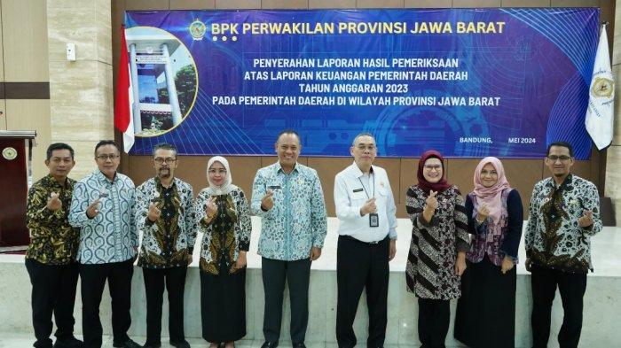Saat menerima penyerahan opini WTP dari Kepala Perwakilan BPK RI Jawa Barat Sudarminto Eko Putra kepada dirinya di Gedung BPK RI Perwakilan Jabar, Rabu (22/5/2024).