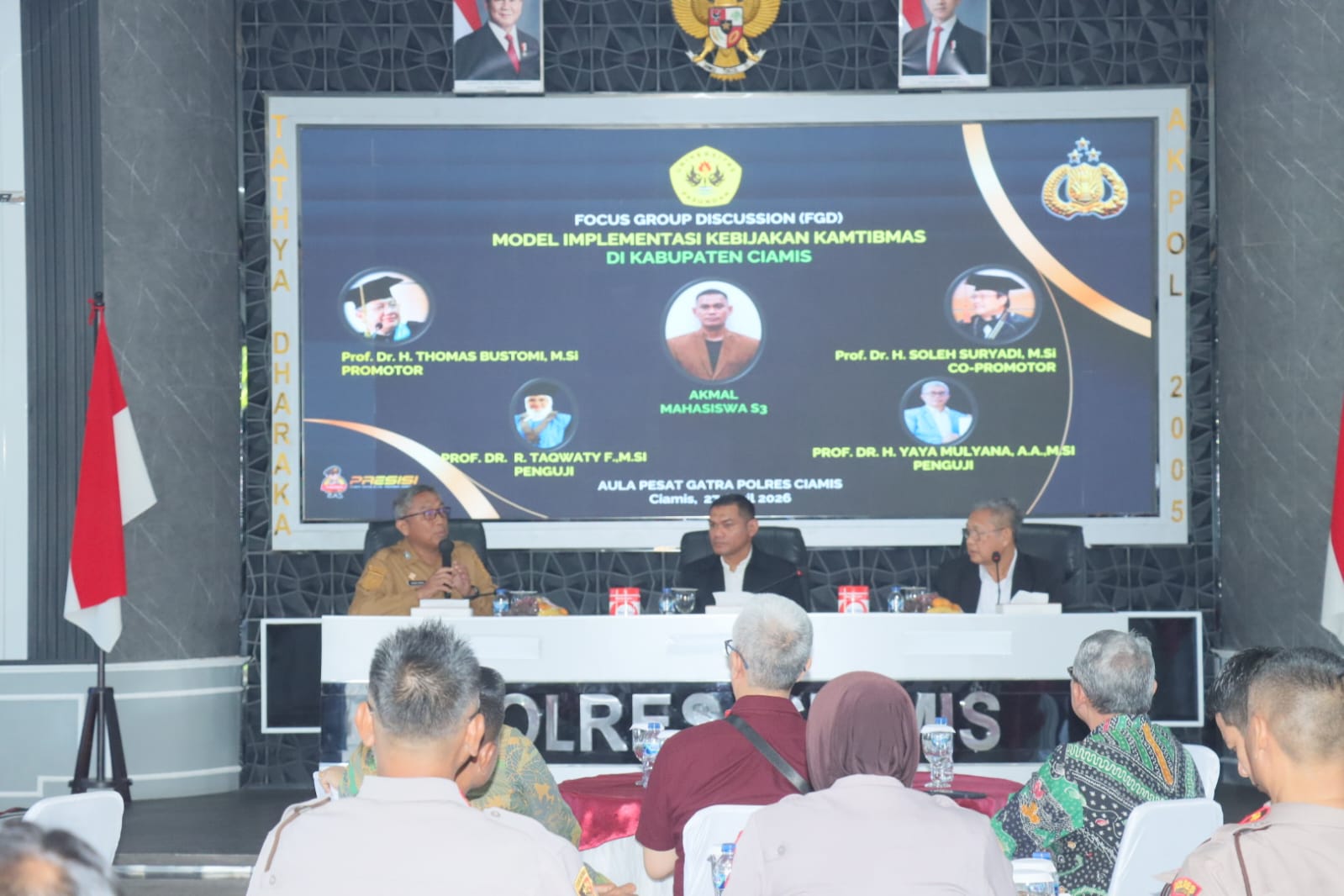 CIAMIS || Sekretaris Daerah Kabupaten Ciamis, Andang Firman Triyadi, menghadiri kegiatan Focus Group Discussion (FGD) bertajuk *Model Implementasi Kebijakan Kamtibmas di Kabupaten Ciamis* yang digelar oleh AKBP Akmal dalam rangka Program Doktor Ilmu Sosial Universitas Pasundan Bandung Tahun 2026. Kegiatan tersebut berlangsung pada Senin (27/04) di Aula Pesat Gatra Polres Ciamis.