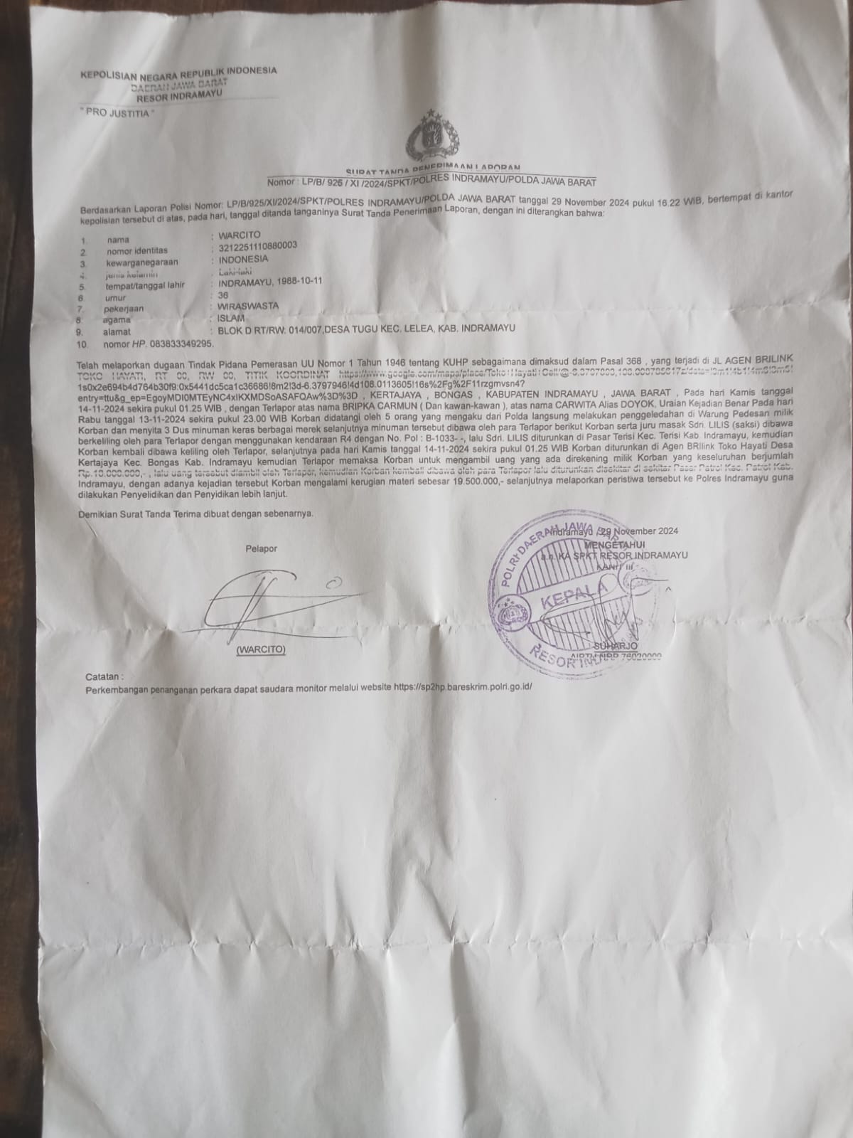“telah melaporkan kejadian dugaan tindak pidana pemerasan ini sesuai dengan Nomor: LP/B.926/XI/2024/SPKT/POLRES INDRAMAYU/POLDA JAWA BARAT. Kejadian ini terjadi di lokasi Jalan Agen Brilink Toko Hayati,” ungkapnya