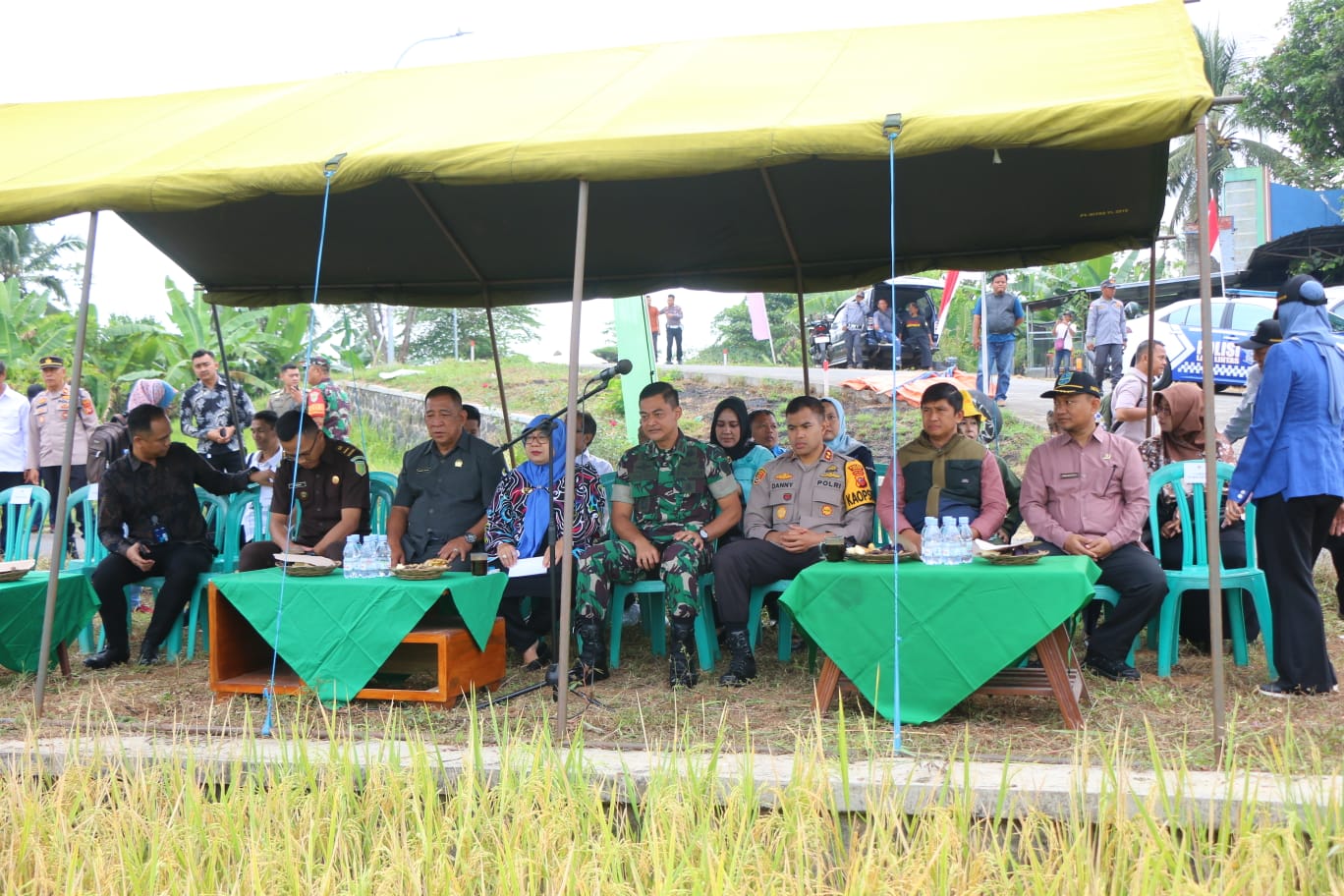 Tampak Komandan Kodim 0613/Ciamis beserta Forkopimda turun langsung ke sawah membawa arit dan mengenakan topi caping memanen secara simbolis lahan pertanian Kelompok Tani Santana 2. Panen raya ini menjadi Indeks Panen (IP) 2 dan tentu akan dilanjutkan tanam kembali sehingga bisa mencapai IP 3.