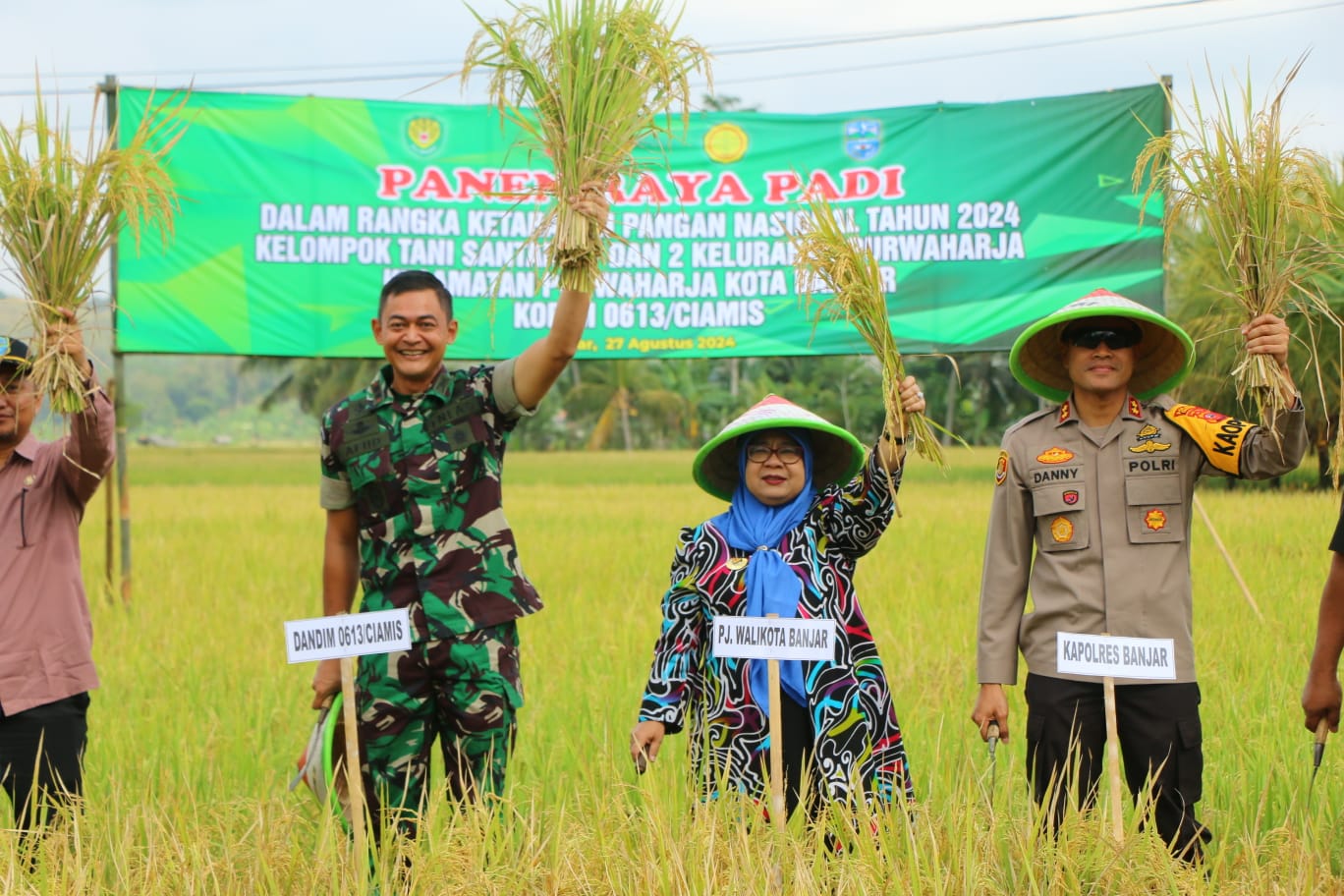 Panen raya ini dilaksanakan langsung oleh Komandan Kodim 0613/Ciamis Letkol Inf Afiid Cahyono, S.Sos., SH., M.Han., Penjabat Wali Kota Banjar Dr. Hj. Ida Wahida Hidayati, SE., SH., M.Si., Kapolres Banjar AKBP Danny Yulianto, S.I.K., M.H., Ketua DPRD Kota Banjar Sementara Drs. H. Dadang R. Kalyubi, M.Si., perwakilan unsur Forkopimda Kota Banjar serta Kelompok Tani Santana 1 dan 2 Kelurahan Purwaharja.